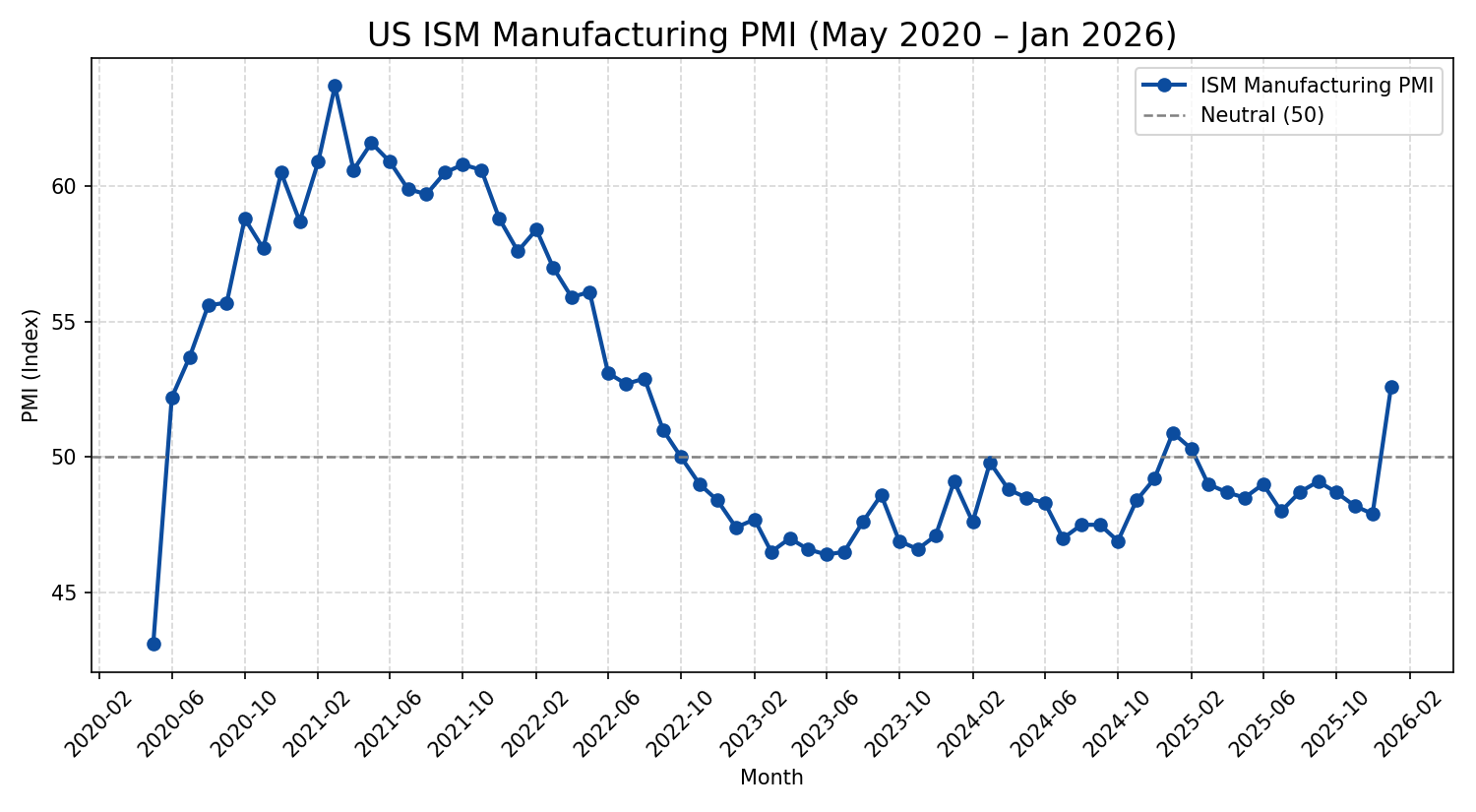 Figure 1: Historical US ISM Manufacturing PMI Trend (May 2020 – Jan 2026). Note the decisive breakout above the 50.0 neutral line in early 2026.